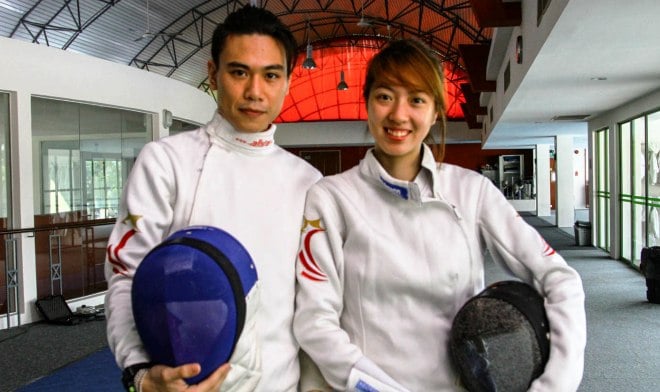 Team Singapore fencers Samson Lee (left) and Cheryl Lim pose for the camera ahead of their Fencing 101 shoot (photo credit: Darren Ho).