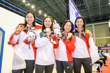 From left: Amanda Lim, Nur Marina Chan, Quah Ting Wen and Quah Jing Wen's win in the 4x100m freestyle relay was Singapore's 1,000th gold in SEA Games history. Photo: SNOC/Andy Chua