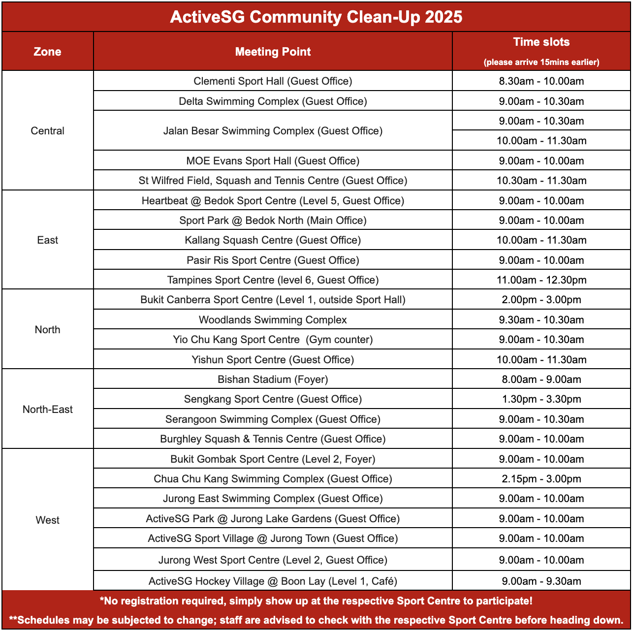 No registration is required. Refer to the schedule below and show up at the respective sport centres to join the initiative!